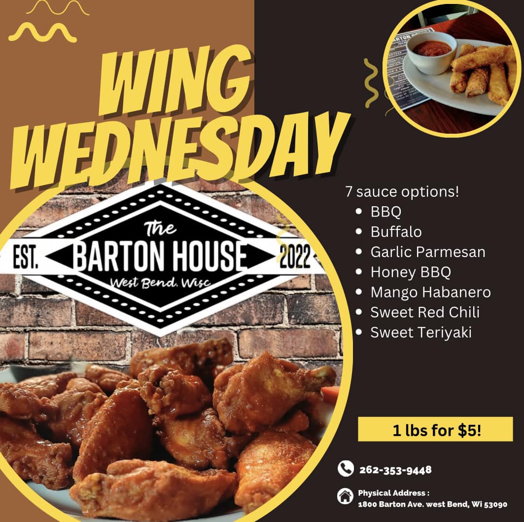Flap on over to The Barton House for Wing Night Wednesday! Just $5 for a 1lb of wings, tossed in your choice of our mouthwatering sauces. Perfect for sharing (or not). Get ready to wing it!